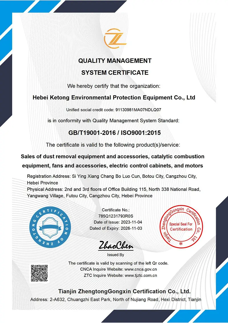 The Hebei Ketong fan has obtained CE certification and national industrial ventilation equipment quality inspection certificates, with reliable quality and safe performance. As a direct sales factory with many years of operation, we have our own standardized production base and complete export qualifications, and can provide one-stop services from product parameter customization, performance testing to after-sales maintenance. During use, the Induced Draft Fan has the advantages of easy maintenance and long service life: daily maintenance only needs regular inspection of the fan’s sealing performance and cleaning of the dust separation device, and the wear-resistant impeller can be replaced independently, reducing the overall replacement cost of the equipment.